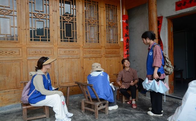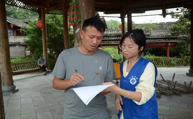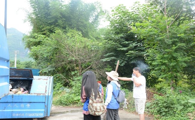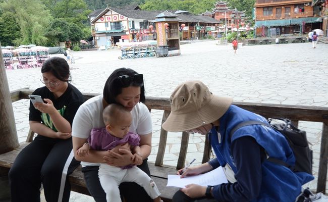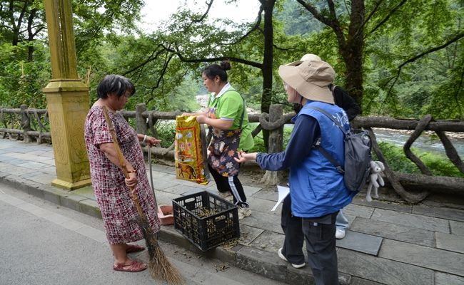 7月9日,为更好地开展调研工作,环境治理小队联系了梵净山村支部副书记张书记,洽谈调研所需配合的相关事项,并详细了解了梵净山村环保意识宣传方面的措施和政策,以及村民对垃圾分类宣传的态度。通过与张书记的交谈,环境治理小队对梵净山村的环境治理情况有了大致的了解。在前往寨沙侗寨的途中,队伍使用“两步路户外助手”对沿途的垃圾桶分布、路面环境、以及锦江上游河流水质进行了详细的拍摄和记录。到达寨沙侗寨后,环境治理小队分成三个小组,分别对游客、个体工商户和原住居民进行问卷调查,了解他们对当地环保宣传、四类基础垃圾的处理方式以及对梵净山村环境治理的建议。