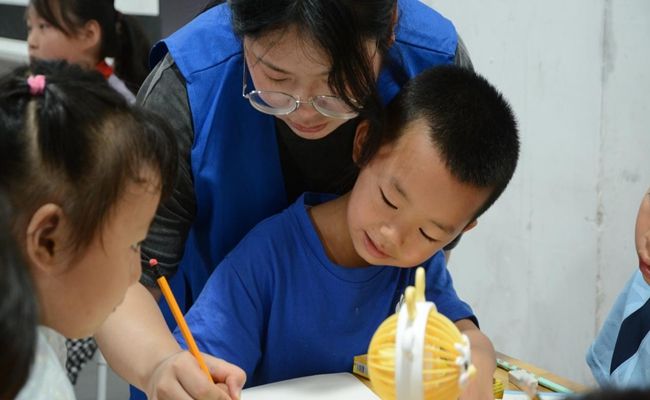 (志愿者为小朋友答疑解惑)
