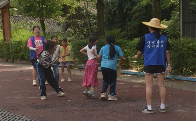 (志愿者和小朋友玩跳大绳)