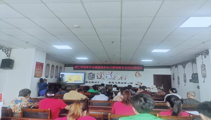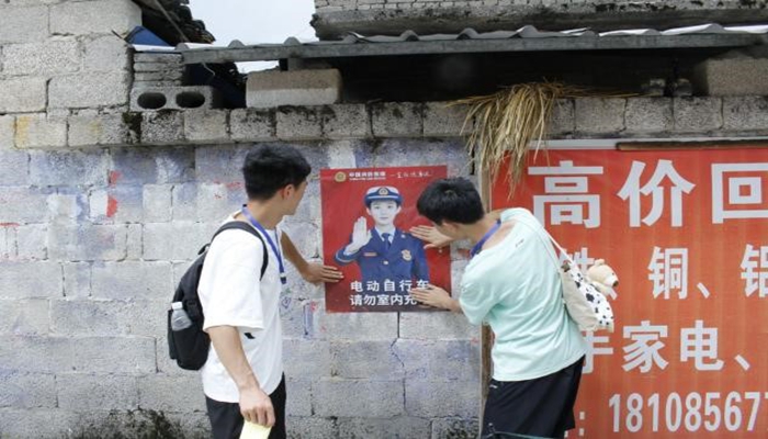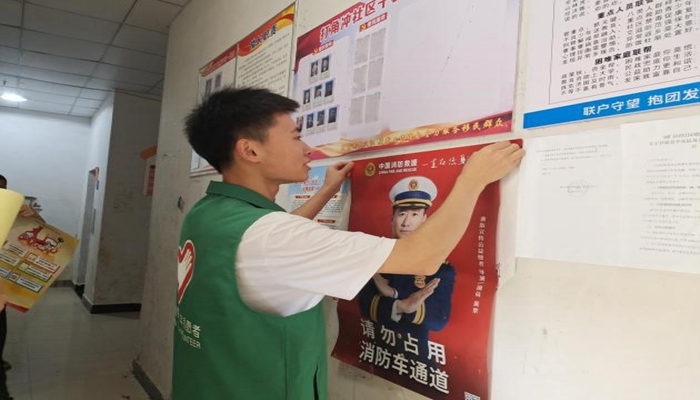 在打角冲社区服务中心,行动团的队员陈宁同学为居民们总体上讲解消防安全知识,提醒居民们在家中的用电用火安全,特别提醒家中有小孩子的居民近期天气炎热不要下河游泳,以及讲解防溺水安全知识。宣讲结束后,行动团的队员们分成两队,一队宣发宣传单,二队张贴海报。一队在街道上为来往的路人、路边休息的居民讲解消防安全知识,遇到不识字的老人队员们耐心仔细地为她们讲解消防安全知识。二队在社区工作人员的带领下进入居民楼,在楼梯口、电梯间张贴警示海报,以此提醒居民用电用火安全,并提醒居民们一定不能在应急车道堆放杂物,和在楼梯口放置插座为电动车充电。