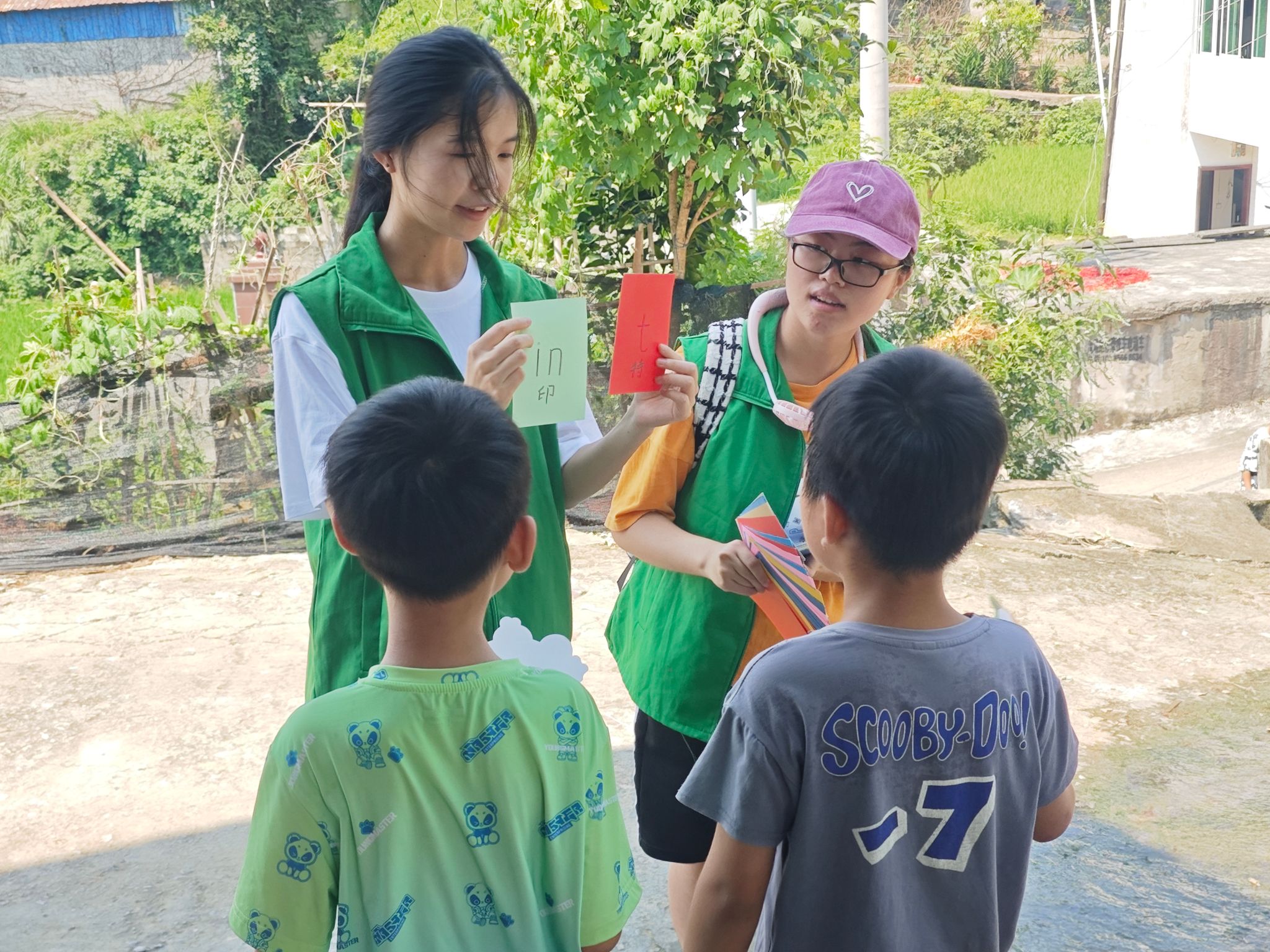 7月9日,实践团精心设计“诵读卡片”和“方言猜词”两项特色活动。在“诵读卡片”环节中,队员们悉心准备了蕴含着古诗词与经典语句的卡片,引导孩子们逐一朗读,以此培养他们的语感和朗读技巧;“方言猜词”环节巧妙地将当地特色方言与普通话相结合,通过生动有趣的双向交流,既让孩子们增进了对家乡文化的了解,又锻炼了他们的语言转换能力。活动接近尾声时,队员们与孩子们共同合唱《让我们荡起双桨》、《虫儿飞》等普通话儿歌,让孩子们在欢快的氛围中更好地掌握语音语调,为此次实践活动画上了一个圆满的句号。