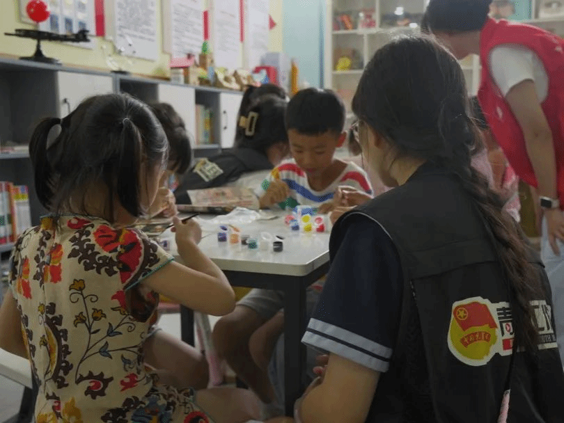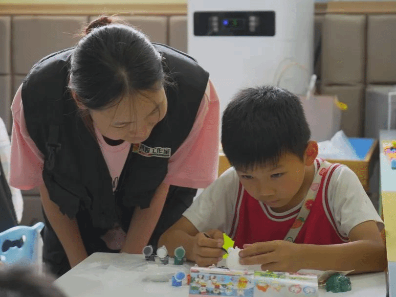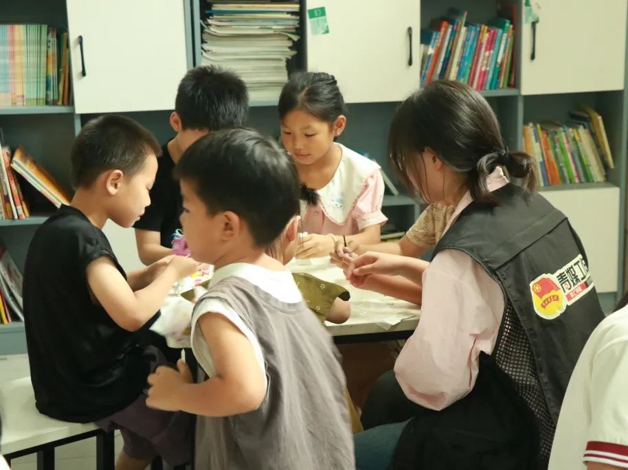 PPT讲解结束后,在社区工作者的带领下,孩子们与队员们一同前往“儿童之家”开展手绘石膏娃娃活动。队员们分组行动,一边架设拍摄设备记录活动瞬间,一边陪伴孩子们创作。