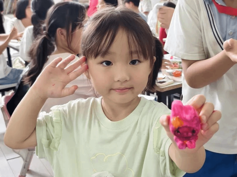 (孩子们向镜头展示石膏娃娃)