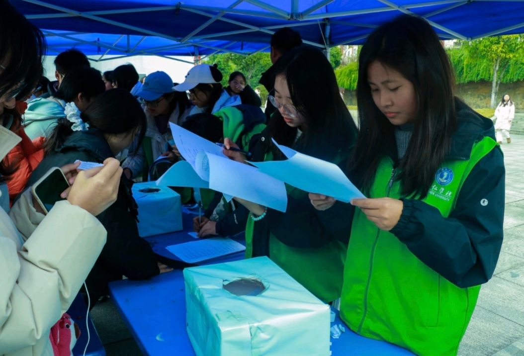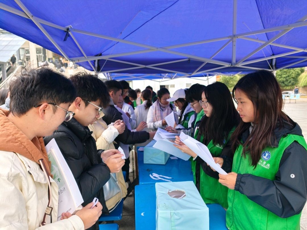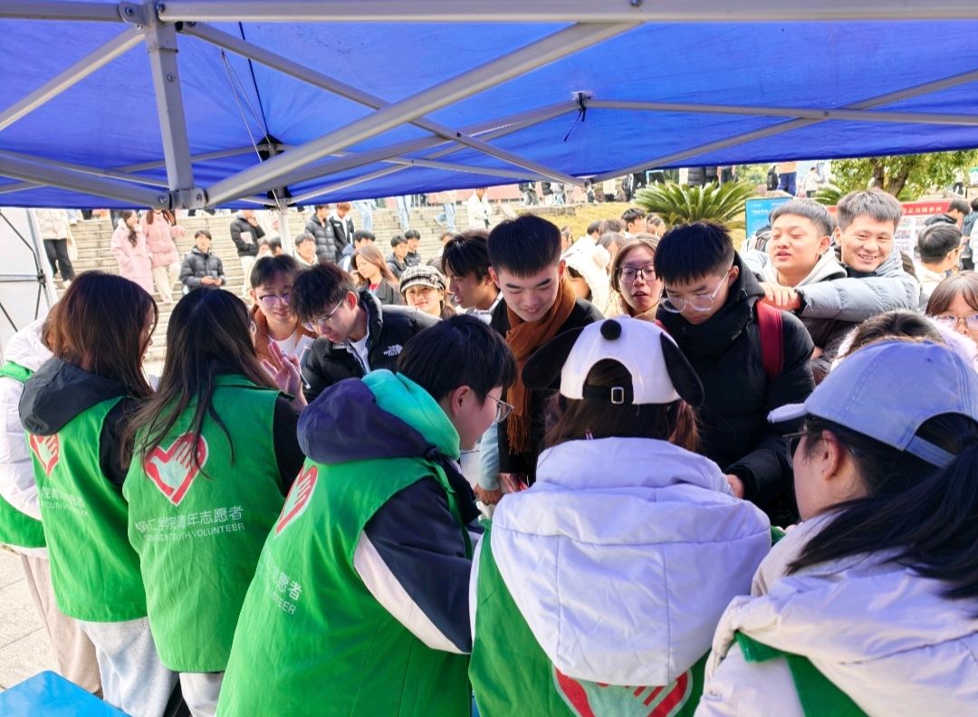 活动当日上午,志愿者们早早抵达丹桂广场布置场地。蓝色帐篷整齐排列,桌上的抽奖箱内塞满了写有问题的纸条。旁边的展板生动记录了各二级学院志愿团队的服务历程与温暖瞬间,这些展板由青年志愿者服务大队精心策划制作,系统梳理了过往志愿活动的轨迹与感人故事,凸显了服务大队在统筹协调、凝聚团队、传承志愿精神方面的重要作用。展板不仅帮助新同学快速了解志愿服务的历史与内涵,也唤起了老成员的共同记忆,营造出“代代接力做志愿”的浓厚氛围,吸引了不少同学驻足观看。“国际志愿者日是哪一天?”“志愿者精神的核心是什么?”“校园里能开展哪些志愿活动?”志愿者们宣传着,向围观的同学抛出一个个贴近生活的问题,现场立刻响起踊跃的抢答声。同学答题成功,接过志愿者递来的奖品,脸上满是笑容。