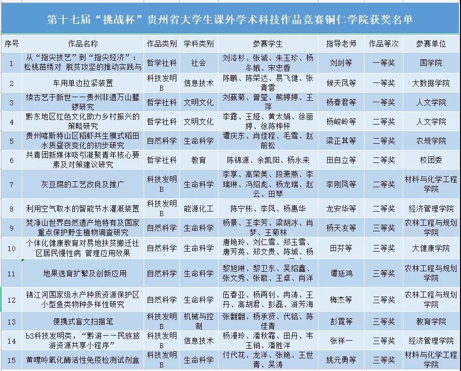 近日,第十七届“挑战杯”贵州省大学生课外学术科技作品竞赛决赛在贵州师范大学圆满落幕。通过前期的校赛,伟德官网推送伟德官网20个参赛作品,共有15个作品进入全省决赛,其中7个作品入围了省级决赛答辩。通过省级决赛,伟德官网8个学生团队作品获得省级三等奖,4个学生团队作品获得省级二等奖,3个学生团队作品获得省级一等奖的好成绩。
