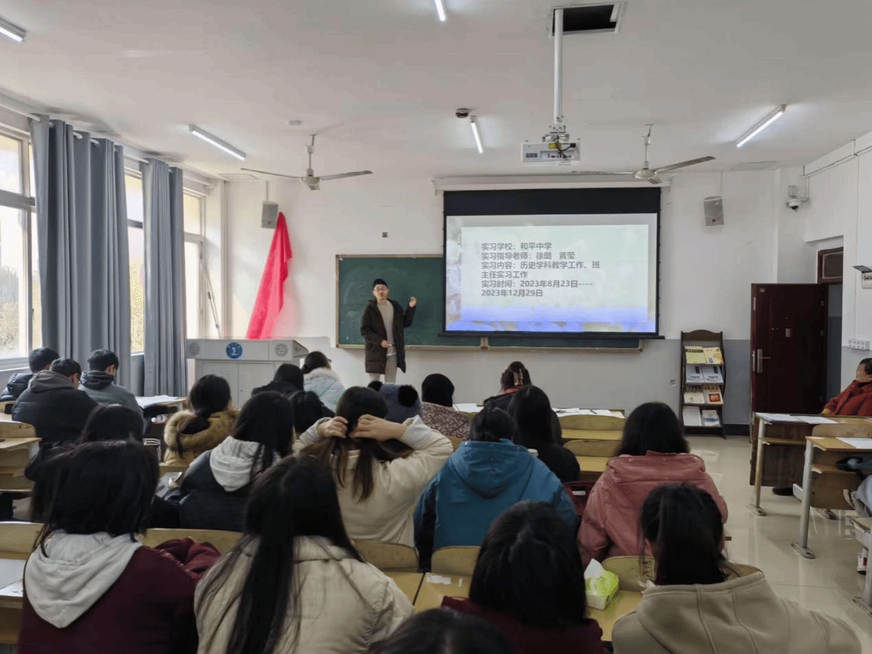 2024年1月2 日上午,哲学与历史文化学院在依仁楼A102召开2020级教育实习总结研讨会。副院长杨峻岭、实习带队教师龙智先以及2020级历史学全体学生参加了本次会议。本学期,2020级历史学专业学生32人分别在铜仁附中、九中、松桃县群希实验学校等10所学校进行了为期四个月的教育实习。在总结会上,10个实习小组组长分别汇报了各个实习学校的实习经历和心得体会。经过四个月的学习和锻炼,同学们在知识积累和实践能力方面均取得了长足的进步。同时,他们深深感受到当代大学生不仅应努力加强自身专业知识和技能的学习,更重要的是应不断提高自身的综合素质和能力、学会如何做人和做事。两个小时的汇报,全场多次响起热烈的掌声。带队教师代表龙智先老师针对实习过程中的教学教法、工作态度、课程设置等问题进行了归纳总结,并对今后的实习工作提出了建设性建议。杨峻岭副院长对实习工作给予肯定和认可,并希望同学们在今后的学习生活中取长补短,不断完善和充实自己,争取更大进步。教育实习近平总书记结研讨会的成功举办,意味着本学期我院教育实习工作的圆满结束。通过这次实习,同学们收获满满,不仅提高了教学水平,也锻炼了团队协作和沟通能力,对教师职业有了更加深刻的认识。非常期待同学们未来在教育领域取得更大的成就。