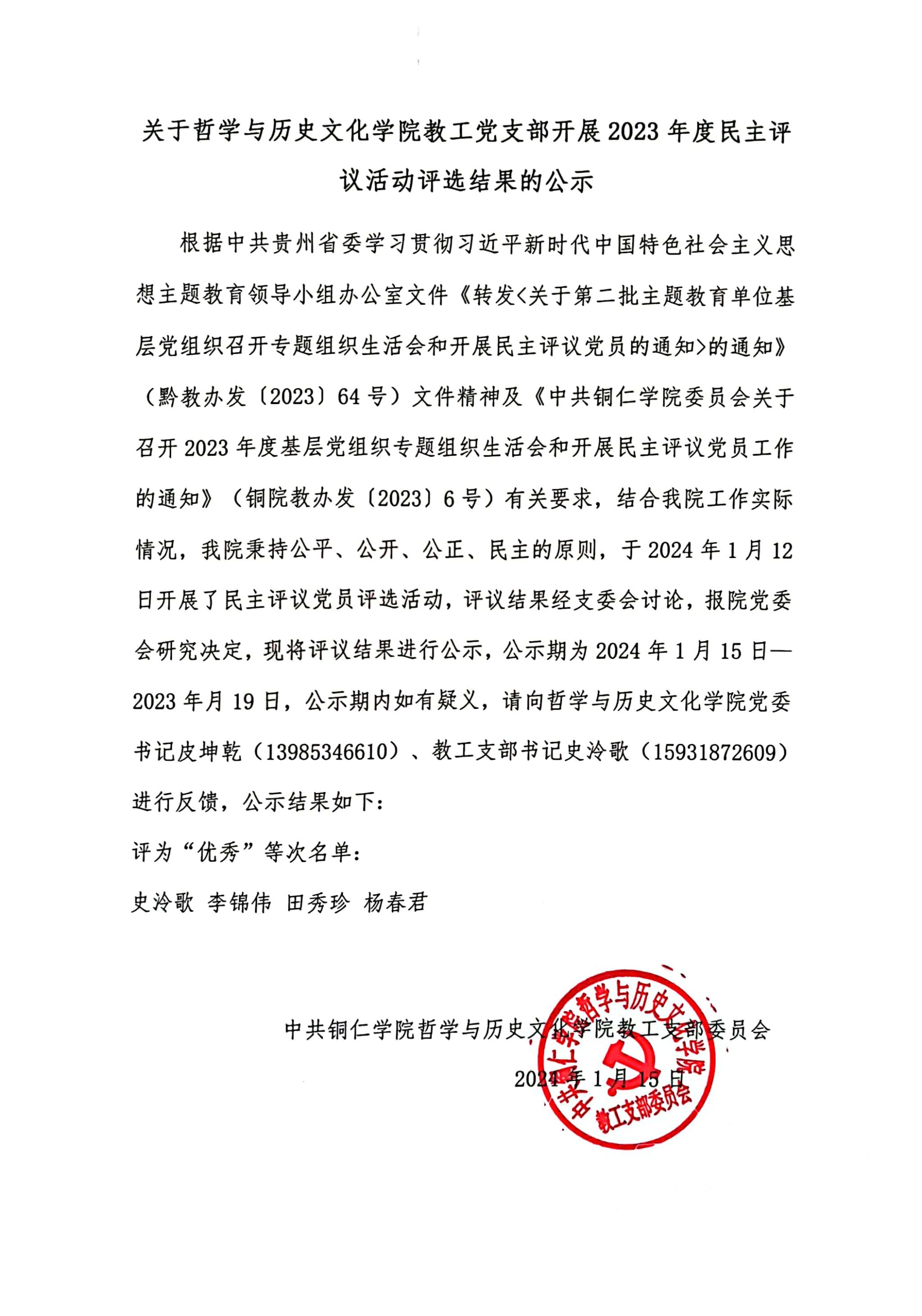 根据中共贵州省委学习贯彻习近平新时代中国特色社会主义思想主题教育领导小组办公室文件《转发<关于第二批主题教育单位基层党组织召开专题组织生活会和开展民主评议党员的通知>的通知》(黔教办发〔2023〕64号)文件精神及《中共bv伟德国际1946委员会关于召开2023年度基层党组织专题组织生活会和开展民主评议党员工作的通知》(铜院教办发〔2023〕6号)有关要求,结合我院工作实际情况,我院秉持公平、公开、公正、民主的原则,于2024年1月12日开展了民主评议党员评选活动,评议结果经支委会讨论,报院党委会研究决定,现将评议结果进行公示,公示期为2024年1月15日—2023年月19日,公示期内如有疑义,请向哲学与历史文化学院党委书记皮坤乾(13985346610)、教工支部书记史泠歌(15931872609)进行反馈,公示结果如下: