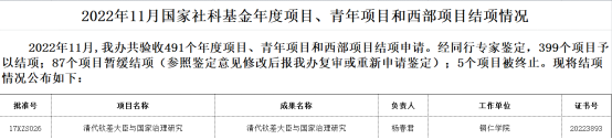 近日,从全国哲学社会科学工作办公室网站获悉,伟德官网哲学与历史文化学院(国学院)杨春君博士主持的国家社科基金项目《清代钦差大臣与国家治理研究》(证书号:20223893)顺利结项,并获良好等次。