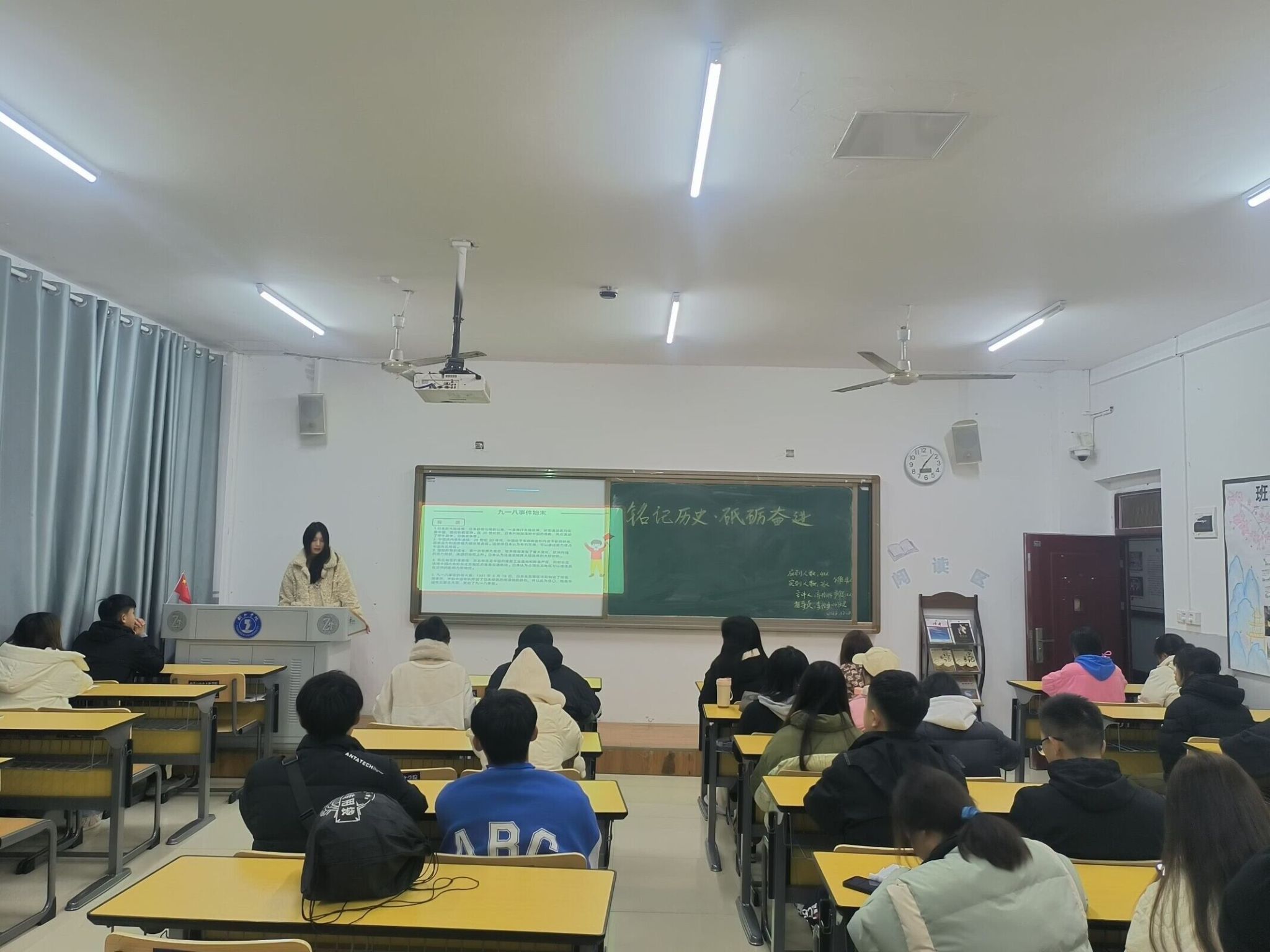 12月11日晚,我院各班于依仁楼A组织召开“铭记历史,砥砺奋进”主题班会活动。通过此次班会活动,让同学们明白了作为新时代的新青年,我们正值风华正茂,意气风发的年纪,我们是民族精神的传承者,我们是祖国明天的建设者,祖国的昨天需要我们铭记,祖国的明天需要我们建设,因此,我们必须要珍惜这大好时光,努力学习,奋发向上。
