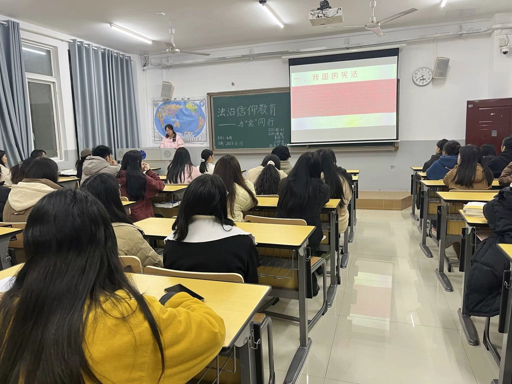 11月27日晚,我院各班于依仁楼A组织召开了“法治信仰教育——与‘宪’同行”主题班会活动。我院各班围绕主题班会展开了学习。如2023级宣讲员利用多媒体向同学们讲解了宪法的概念:又称宪章、根本法,是主权国家或地区具有最高法律效力的根本大法,通常规定一个国家或地区的社会制度、国家制度、国家机构和公民的基本权利与义务等。也通过视频的方式向同学们展示了我们身边的法律,如劳动法、未成年人保护法等。2022级宣讲人采用提问的方式给同学们普及宪法知识,了解到常见的违法行为有违反治安管理处罚条例的扰乱公共秩序、违反环境法的超标排放污染物等,让同学们知法懂法,做法治信仰者、法治捍卫者。通过本次班会的开展,让同学们学习到了宪法的基本知识及如何做宪法坚定捍卫者:大学生要树立法制观念、尊重法律权威、学习法律知识、养成守法习惯、提高用法能力、不断提升自己的法治素养。