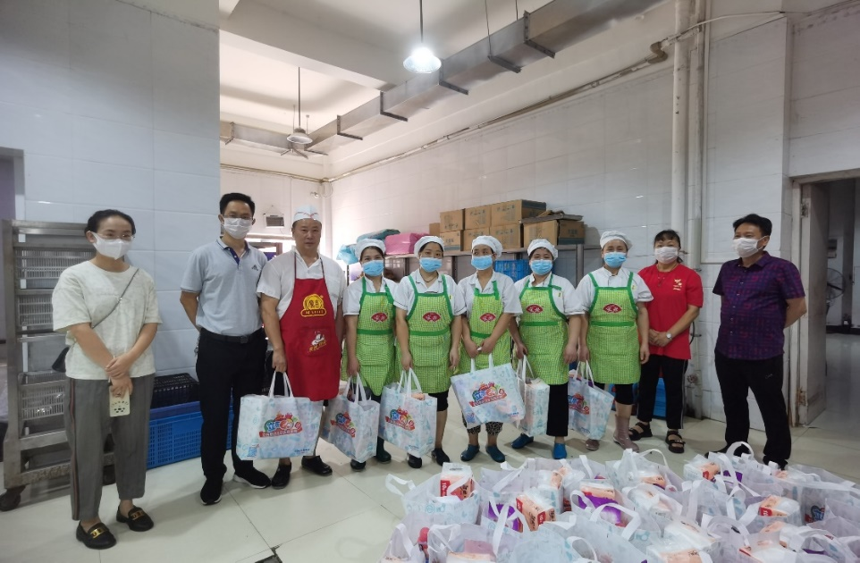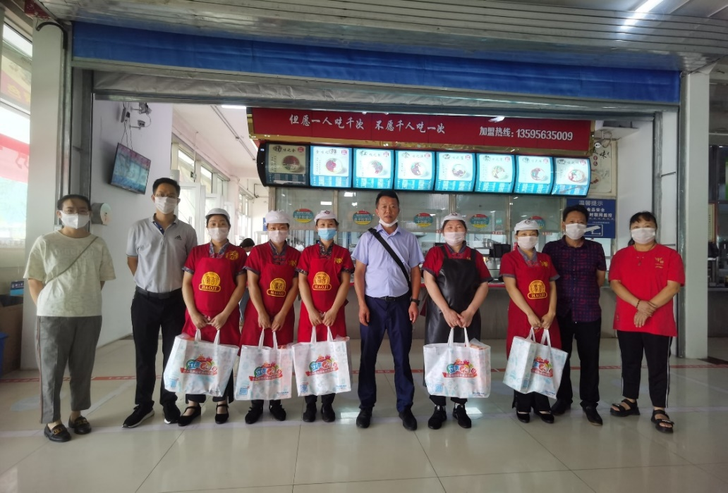 后勤管理处副处长鲁道旺、肖庭华、杨红为食堂员工送去节日的祝福和慰问品,感谢员工们一直以来为学校食堂工作辛勤的付出,感谢他们在节日期间坚守岗位,为师生服务。