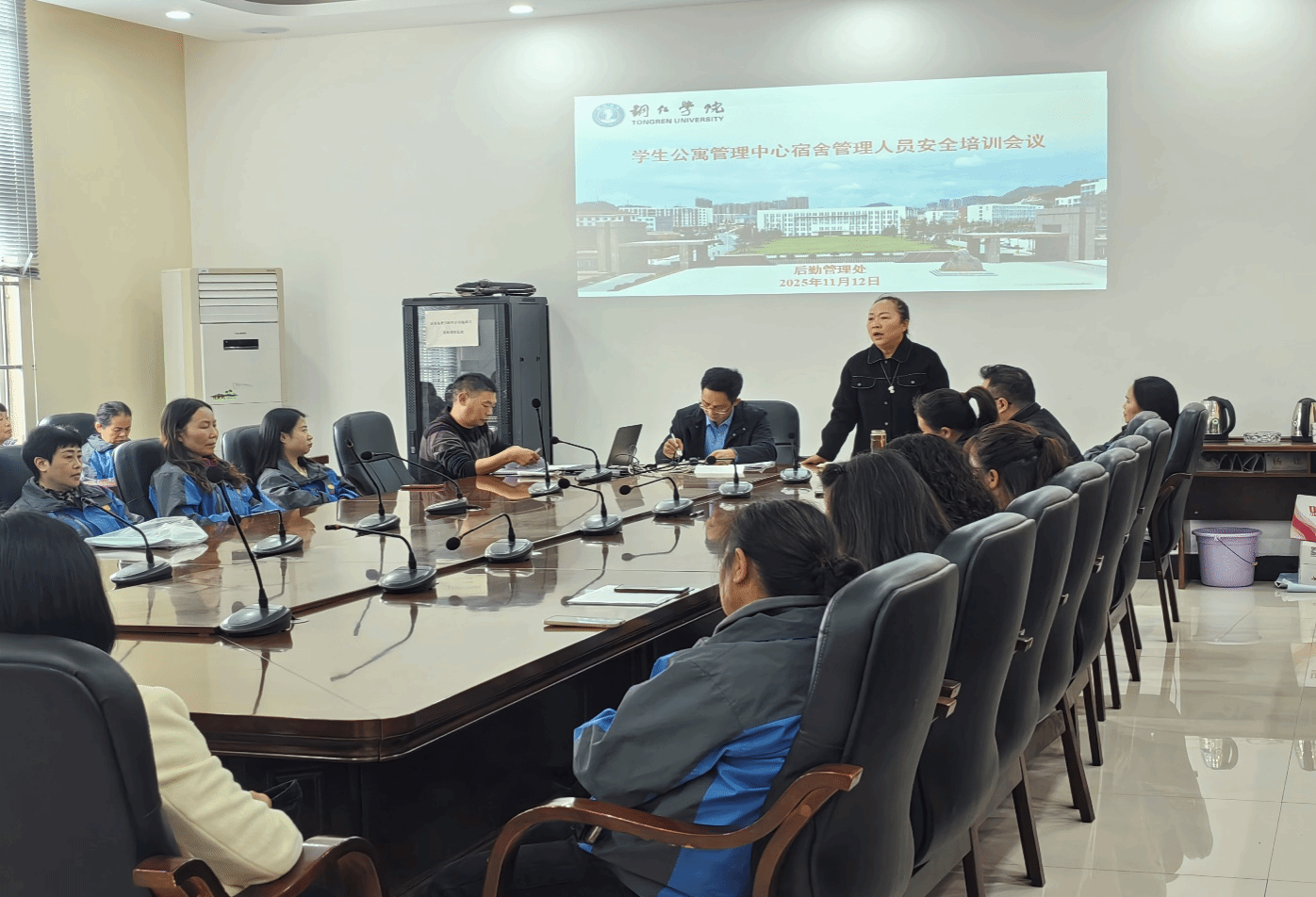 为了更好地做好学生公寓管理工作,增强安全意识和服务意识,广泛听取学生公寓宿舍管理人员对学生公寓管理工作的意见和建议,促进后勤服务质量提升。11月12日,在后勤处会议室召开了学生宿舍管理工作安全培训会议。后勤管理处鲁道旺处长、杨红副处长、桃园物业管理公司相关管理人员和全体宿管员参加会议。会议由学生公寓管理中心主任杨秀军主持。