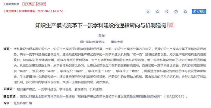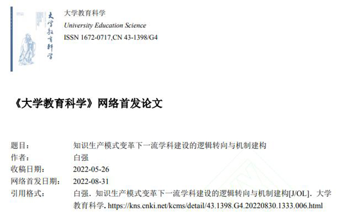 8月31日,高等教育研究领域重要学术期刊《大学教育科学》网络首发伟德官网白强教授的最新研究成果《知识生产模式变革下一流学科建设的逻辑转向与机制建构》,该成果将在该期刊2022年第5期纸质刊印。该成果15000字,是白强教授近年来相继发表研究成果《大学知识生产模式变革与学科建设创新》(2020年)《世界一流学科的生成逻辑与建设路径——基于中外两所大学两个一流学科生长史的考察》(2019年)《中国特色“双一流”大学建设的逻辑根据与路径选择》(2018年)等CSSCI核心来源期刊论文之后关于学科建设的最新研究成果。