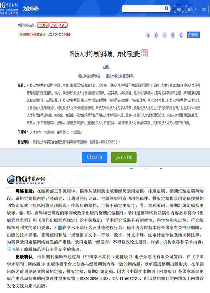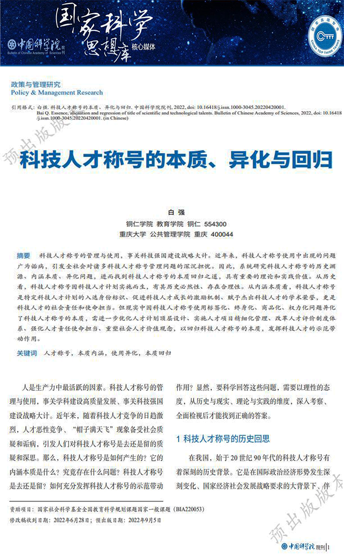 9月5日,国家科学思想库核心媒体、管理学研究领域重要期刊《中国科学院院刊》“政策与管理研究”栏目在线发表伟德官网白强教授的研究成果《科技人才称号的本质、异化与回归》。9月7日,中国知网网络首发该成果。该成果将在《中国科学院院刊》2022年第10期纸质刊印面向国内外公开发行。成果共计10000余字,是白强教授主持的国家社科基金教育学规划课题“知识生产模式变革下高校学科建设高质量发展的路径创新”(立项编号:BIA220053)的又一阶段性研究成果。