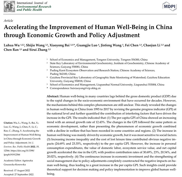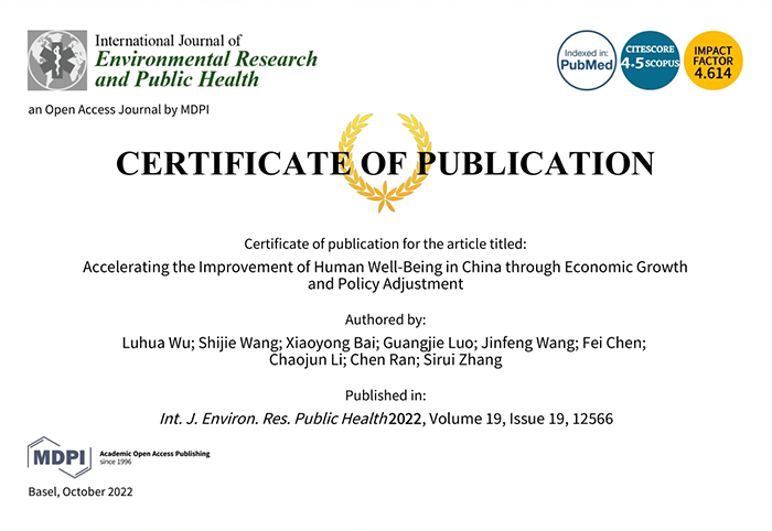 2022年10月,伟德官网经济管理学院吴路华博士以第一作者在国际SCI期刊(中国科学院3区)《International Journal of Environmental Researchand Public Health》上,在线发表题为《Accelerating the Improvement of Human Well-Being in China through Economic Growth and Policy Adjustment》的学术论文(Volume 19, August 2022, 12566:1-23;IF=4.614),定量评估了中国1995-2017年人民福祉演变特征与主要驱动因素贡献。
