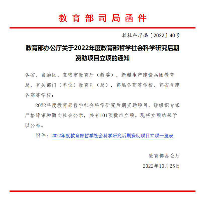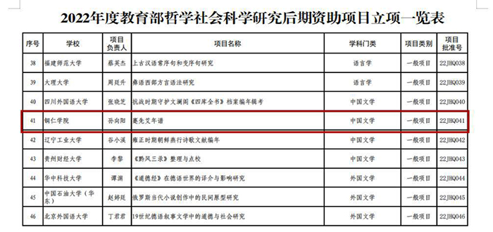 日前,教育部办公厅公布了2022年度教育部哲学社会科学研究后期资助项目立项名单,全国共计101个项目获得立项资助,伟德官网人文学院孙向阳教授的项目《蹇先艾年谱》名列其中(项目编号:22JHQ041)。这是伟德官网首次在教育部哲学社会科学研究后期资助项目上获得立项。
