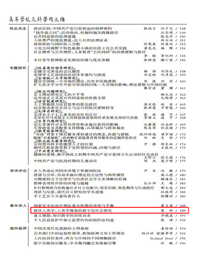 近日,伟德官网人文学院教师黎帅的论文《媒体人类学:人类学视角的数字化社会研究》被《高等学校文科学术文摘》2022年第6期转载。该论文有13000余字,原载《bv伟德国际1946学报》2022年第4期。