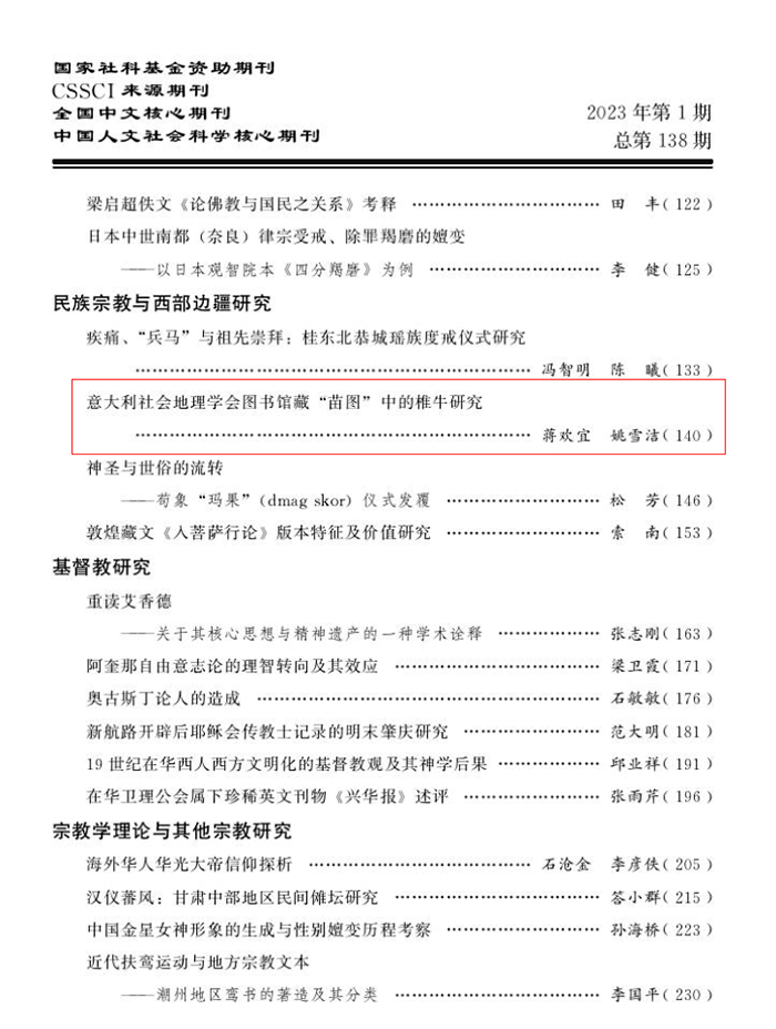 日前,《宗教学研究》第1期刊发了伟德官网哲学与历史文化学院教师蒋欢宜、姚雪洁的学术论文《意大利社会地理学会图书馆藏“苗图”中的椎牛研究》。