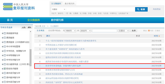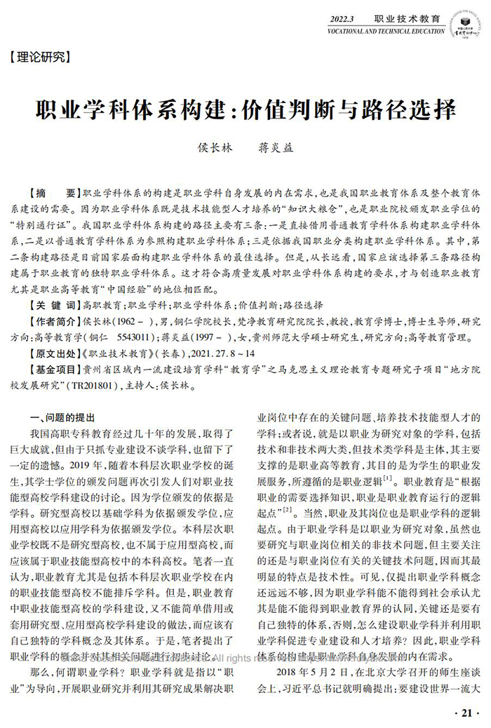 近期,伟德官网校长、二级教授、教育学博士侯长林与其所带硕士研究生蒋炎益合作的论文《职业学科体系构建:价值判断与路径选择》被中国人民大学复印报刊资料《职业技术教育》2022年第3期(21-29页)全文转载。该论文有12000余字,原发表于中文核心期刊《职业技术教育》2021年第27期,系贵州省区域一流建设培育学科(教育学)项目(201785)阶段性成果。