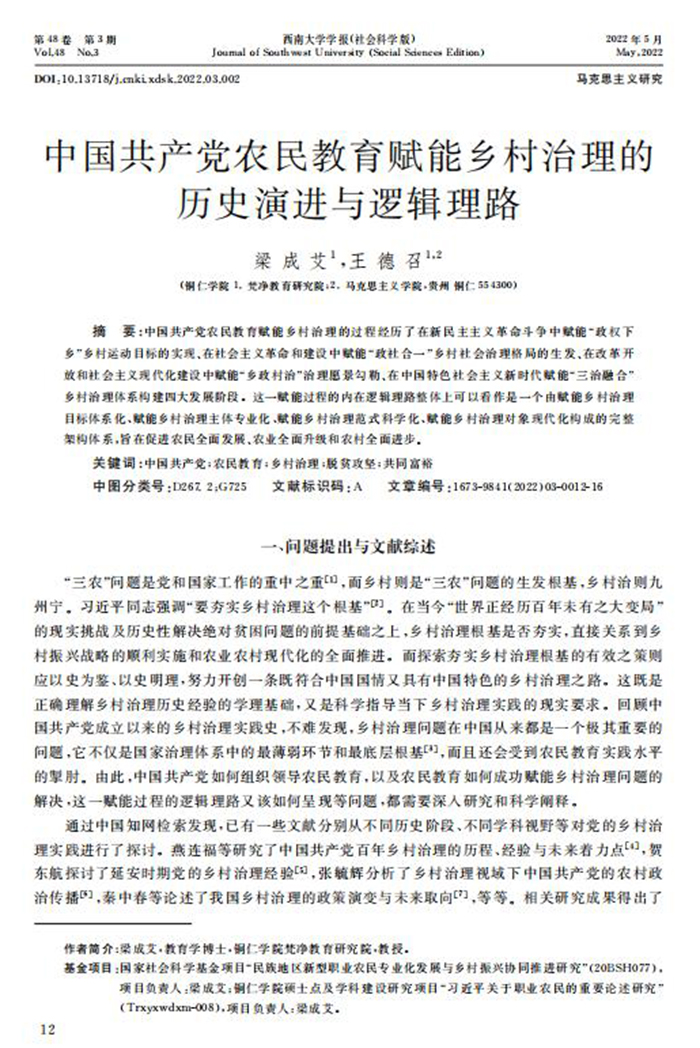 近日,伟德官网教教育学院院长梁成艾教授在教育类一级期刊《西南大学报》(社会科学版)2022年第3期发表高水平论文《中国共产党农民教育赋能乡村治理的历史演进与逻辑理路》。该论文26000余字,是继2022年1月发表于一级期刊《学习与探索》上的论文《新型职业农民专业化:形成机理、生长逻辑与发展旨归》、2021年12月发表于一级期刊《民族教育研究》上的论文《民族地区职业教育赋能乡村振兴的逻辑与路径》及2021年6月发表于一级期刊《教育学报》上的论文《百年来中国共产党农民教育的历史变迁与发展愿景》等之后关于农民教育研究的最新成果。该论文选题宏大,研究视角独特,研究方法创新,呈现了中国共产党农民教育赋能乡村治理学术观点。该论文被外审专家评价:“研究思路清晰,内容充实,显示了作者扎实的学术功底和严谨的学术态度。”
