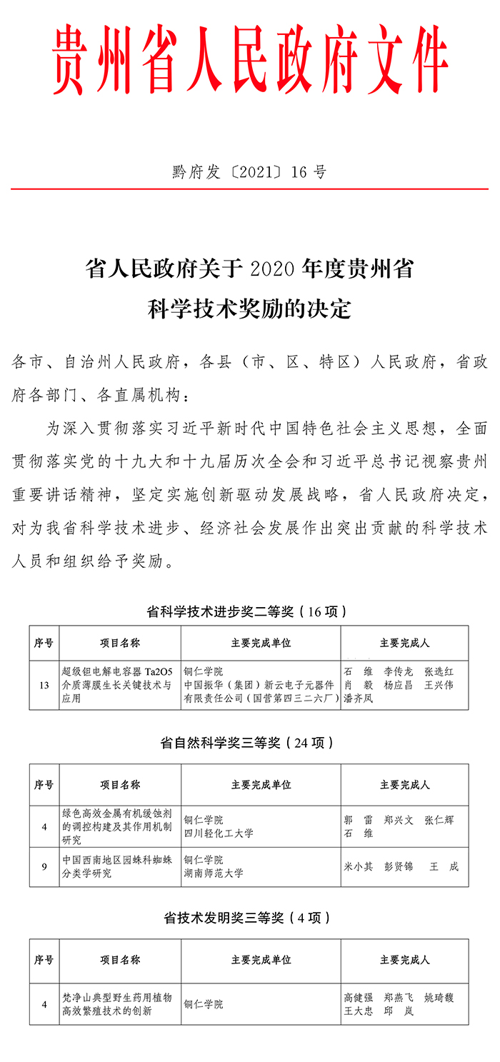 近日,全省科技创新暨科技奖励大会在贵阳举行,伟德官网共有7项成果获得2020年度、2021年度贵州省科学技术奖。其中,省科学技术进步奖二等奖1项、省科学技术进步奖三等奖1项,省自然科学奖三等奖4项、省技术发明奖三等奖1项。获奖数量位列地方高校第一。
