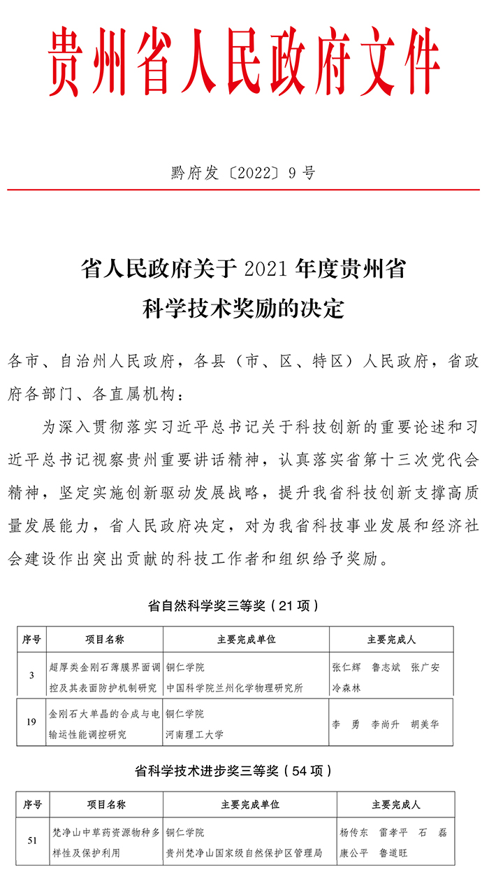 杨传东等人的成果《梵净山中草药资源物种多样性及保护利用》获得省科学技术进步奖三等奖。该研究成果历时11年多的时间开展野调查研究,较为全面地摸清了梵净山药用植物的本底2299 种(含变种),同时研究中发现了贵州新分布的药用植物近100种,发现植物新类群贵州蛇根草1种,从而进一步丰富了贵州的药用植物资源及植物界的多样性,为我省药用植物的开发利用及植物区域、植物多样性等研究提供了极为重要的参考资料。