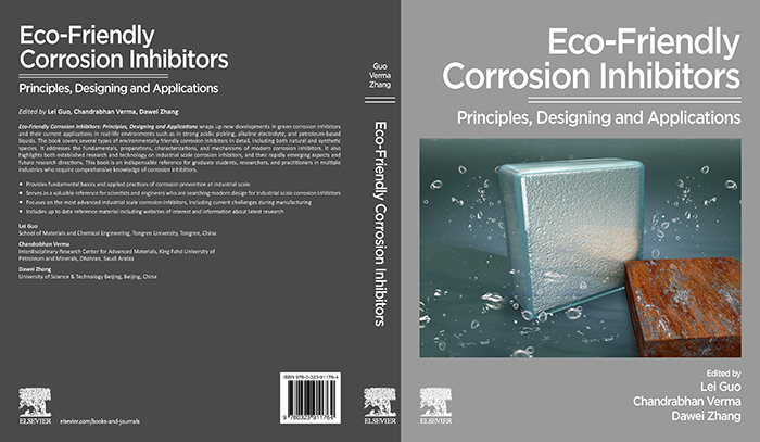近日,由伟德官网郭雷教授、法赫德国王石油矿产大学Chandrabhan Verma研究员、北京科技大学张达威教授共同主编的全英文著作Eco-Friendly Corrosion Inhibitors(《环境友好型缓蚀剂》,ISBN 9780323911764)由Elsevier出版社出版,全球发行。
