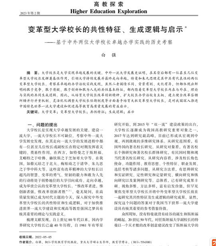 近日,我国高教研究领域CSSCI重要期刊《高教探索》发表伟德官网白强教授关于变革型大学校长研究的成果《变革型大学校长的共性特征、生成逻辑与启示——基于中外两位大学校长卓越办学实践的历史考察》,全文12000余字,在学界首次明确提出“变革型大学校长”学术概念,并以被誉为“硅谷之父”的特曼和“华工之父”的朱九思中外两位卓越大学校长为例,通过对其卓越办学实践的历史考察和深入分析,揭示中外变革型大学校长的共性特征和生成逻辑,由此提出大力培育大批变革型大学校长、推进中国特色世界一流大学建设和促进高等教育高质量发展的学术观点和路径主张。