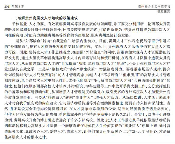 近日,伟德官网教育学院白强教授依托其主持完成的贵州省教育科学规划重点课题《贵州省高等教育发展瓶颈、影响因素及赶超策略研究》撰写的资政报告《关于破解贵州高层次人才短缺问题的建议》,经严格审核、推荐,被《贵州社会主义学院学报》第3期“资政建言”专栏采纳。该报告是白强教授在前期高等教育理论研究基础上聚焦我省高等教育改革发展、为推动我省高等教育快速崛起建言献策的又一应用性研究成果。