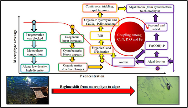 研究发现,处于不同稳态的湖泊,磷供应途径和潜在机制也是截然不同的。在藻类占优势的湖泊中,主要的磷再生途径仍然为缺氧驱动的铁结合态磷的释放和解吸;在处于由大型植物向藻类过渡后期的湖泊,磷溶菌驱动的有机磷水解和钙结合态磷的解离对湖泊磷的再生具有重要作用;在处于由水生植物向藻类过渡早期的湖泊,外源磷输入是主要的磷供应方式;在以大型水生植物占优势的湖泊中,磷的再生是被阻断的。且结果表明,多种营养循环特别是碳、氮、磷、氧、铁循环的偶联可有效增加磷再生途径的多样化和再生强度。