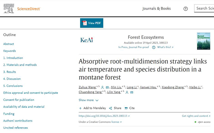 伟德官网王祖华博士长期从事林学的研究,近日在林学领域取得了重要研究进展,相关成果“Absorptive root-multidimension strategy links air temperature and species distribution in a montane forest”发表在中国科学院1区期刊《Forest Ecosystems》(IF=4.274,https://doi.org/10.1016/j.fecs.2023.100113)上。