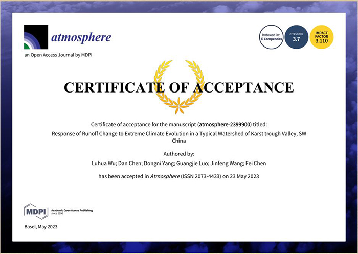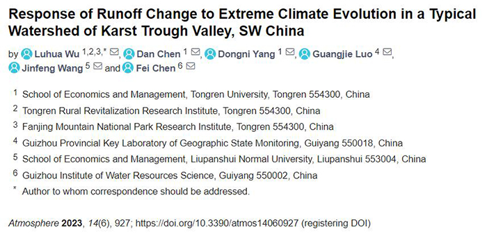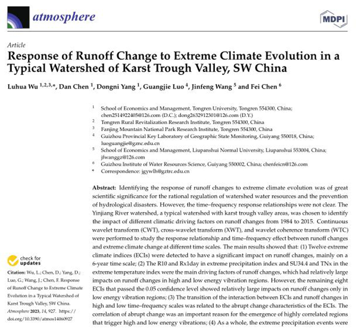 论文主要信息如下:Wu, L.; Chen, D.; Yang, D.; Luo, G.; Wang, J.; Chen, F. Response of Runoff Change to Extreme Climate Evolution in a Typical Watershed of Karst Trough Valley, SW China. Atmosphere 2023, 14(6), 927:1-20. https://doi.org/10.3390/atmos14060927.