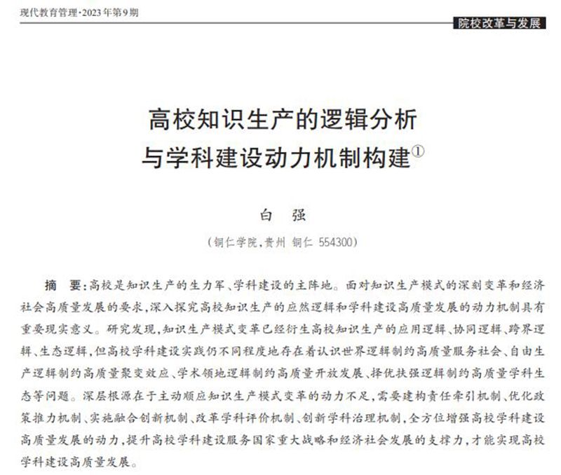 成果3:《高校知识生产的逻辑分析与学科建设动力机制构建》一文13000字,于2023年9月发表在教育学研究领域重要期刊《现代教育管理》2023年第9期。文章立足知识生产模式深刻变革的大背景、大趋势,揭示了知识生产模式变革衍生高校知识生产四重新逻辑,分析了高校学科在高质量知识生产过程中存在的逻辑障碍、现实困境和深层根源,并从责任牵引、政策推力、融合创新、学科评价、学科治理五个方面提出了机制建构的具体建议,为全方位增强高校学科建设发展动力、促进高校学科高质量发展提供了新路径。《现代教育管理》系辽宁省教育厅主管、辽宁教育研究院主办的CSSCI核心(扩)来源期刊、教育类综合性理论学术刊物,在教育研究领域具有广泛的学术影响。