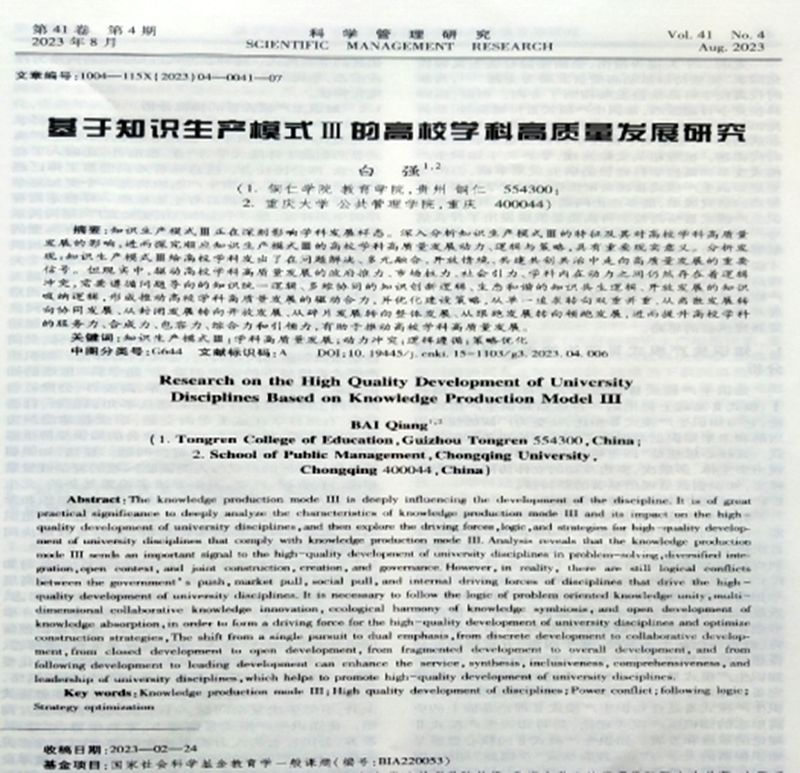 成果2:《基于知识生产模式Ⅲ的高校学科高质量发展研究》一文13000字,于2023年8月发表在管理学领域重要期刊《科学管理研究》2023年第4期。文章在深入分析知识生产模式Ⅲ特征及其对高校学科高质量发展深刻影响的基础上,揭示了知识生产模式Ⅲ给高校学科发出走向高质量发展的四个重要信号,分析了驱动高校学科高质量发展的4重动力及逻辑冲突,提出了促进高校学科高质量发展的逻辑遵循主张和策略优化建议,为高校学科建设在承接时运中走向高质量发展提供了新思路。《科学管理研究》系内蒙古自治区软科学研究会主办的管理学领域CSSCI核心来源双月刊,主要针对科技创新的重大现实问题和前瞻问题展开研究,在管理科学研究领域具有广泛的学术影响。