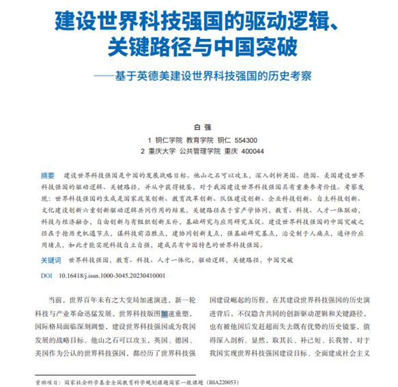 成果4:《建设世界科技强国的驱动逻辑、关键路径与中国突破——基于英德美建设世界科技强国的历史考察》一文13000余字,经多位院士和自然科学史专家历时数月评审,将于2023年11月发表在管理学领域重要期刊《中国科学院院刊》2023年第11期。专家认为,“这是从历史出发、观照现实、展望未来的宏观论述,对于我们理解科技强国的发展历程、思考中国如何实现科技自立自强具有启发性。文章史论结合,论从史出,观点明确,结构严整,视角宏大,完成如此宏大命题,难能可贵。”该文在梳理英国、德国、美国建设世界科技强国演进历史的基础上,揭示建设世界科技强国的驱动逻辑,剖析隐藏其中的关键路径,指出三国建设世界科技强国的得失镜鉴,提出我国建设世界科技强国的突破路径建议,为我国建设世界科技强国提供了重要咨政建言。《中国科学院院刊》系我国最高自然科学机构中国科学院主办的以科技发展战略研究为主的国家核心智库媒体和向中央报送科技发展重要方略的直通平台,重点刊登中国科学院院士、中国工程院院士就我国科技发展领域重大战略问题的研究成果,系CSSCI、CSCD、北大中文三核心来源期刊,具有重要的学术影响力与咨政服务力。该刊再度采用白强教授的研究成果,体现了伟德官网学者较强的宏观战略研究能力和较高的战略决策服务水平。
