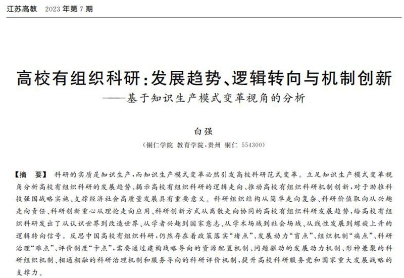 成果1:《高校有组织科研:发展趋势、逻辑转向与机制创新——基于知识生产模式变革视角的分析》一文16000余字,于2023年7月发表在高教领域重要期刊《江苏高教》2023年第7期,系白强教授二度在该刊发表高水平研究成果。文章立足知识生产模式变革视角、运用知识生产模式理论分析框架,从高校有组织科研的“发展趋势是什么”“逻辑朝哪里转”“什么机制才有效”三个方面,深入分析了高校有组织科研从“小科学”到“大科学”、从小团队到“大兵团”的理论与实践逻辑转轨问题,为强化高校有组织科研、推动重大原始创新、促进关键核心技术突破、服务国家发展战略和支撑经济社会高质量发展提供了新洞见。《江苏高教》系江苏省教育厅主管、江苏教育报刊总社主办的我国高教研究领域非常活跃的CSSCI核心来源期刊。该刊着重从理论和实践两个方面探索高等教育改革发展前沿问题,被全国众多高校列为高等教育学博士研究生的必读刊物。