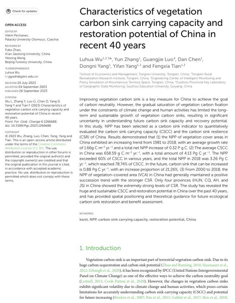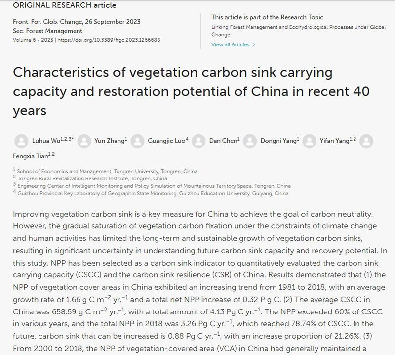 论文主要信息如下:Wu L*, Zhang Y, Luo G, Chen D, Yang D,Yang Y, Tian F. Characteristics of vegetation carbon sink carrying capacity and restoration potential of China in recent 40 years. Front. For. Glob. Change. 2023, 6:1266688:1-17. https://doi.org/10.3389/ffgc.2023.1266688.
