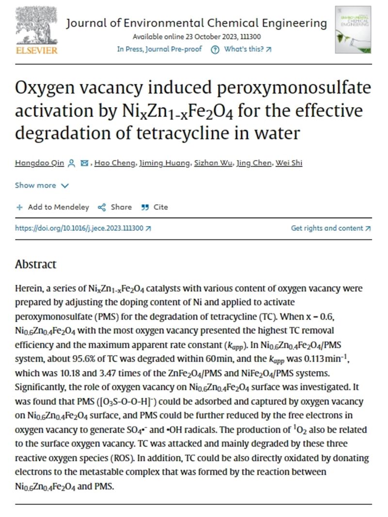 近日,伟德官网材料与化学工程学院秦航道博士(第一作者兼通讯作者)的论文“Oxygen vacancy induced peroxymonosulfate activation by NixZn1-xFe2O4 for the effective degradation of tetracycline in water”发表于SCI期刊《Journal of Environmental Chemical Engineering》。