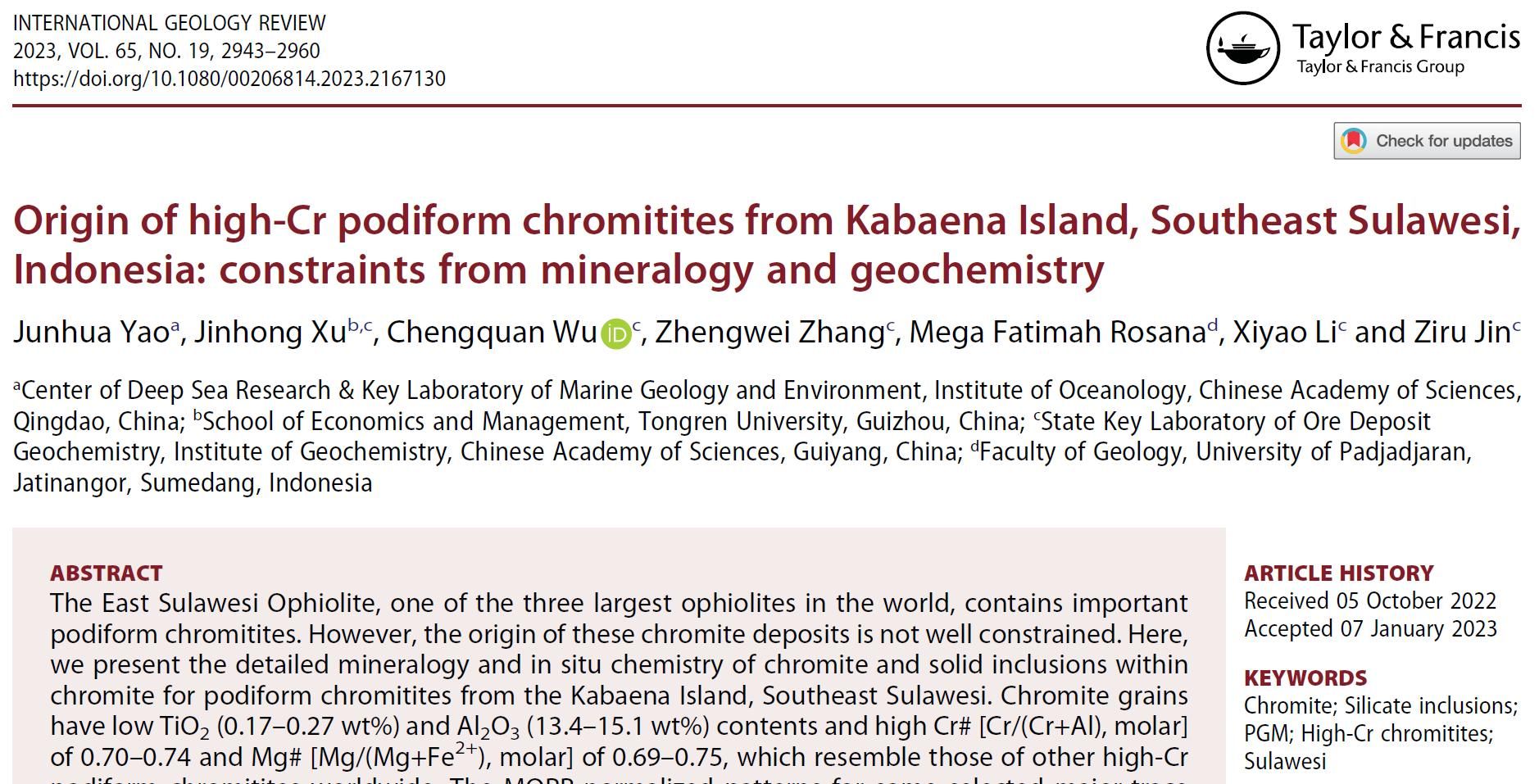 徐进鸿博士与中国科学院地球化学研究所张正伟研究员和吴承泉副研究员、中国科学院海洋研究所姚俊华博士、印度尼西亚巴巴查查兰大学(University of Padjadjaran) Mega Fatimah Rosana教授、印度尼西亚PT. Wilton公司(PT. Wilton Wahana Indonesia) Wijaya Lawrence和Haifeng Wang等合作,以印度尼西亚苏拉威西卡巴耶拿岛(Kabaena Island)铬铁矿为研究对象,通过开展矿物学、元素地球化学、原位矿物微量元素等分析,发现该铬铁矿中含有橄榄石、单斜辉石、斜方辉石、角闪石、碱金属硫化物以及铂族矿物包裹体,表明其母岩浆经历了从高温低硫逸度向低温高低硫逸度的转变;单斜辉石-斜方辉石矿物对温压计显示其形成温度和压力分别为950–1010 °C和7.0–8.4 Kbar,来源于上地幔;橄榄石包裹体具有极高的Mg指数(Fo >96)和极高的Ni (5300–8200 ppm)和Cr (1500–6700 ppm)含量,表明其来源于于高Mg和Cr的玻安质熔体,并经历了Fe–Mg和Fe–Ni交换再平衡过程;综合苏拉威西岩相古地理表明卡巴耶拿铬铁矿形成于新生岛弧,为下一步矿山勘查开发提供了重要依据。相关成果以徐进鸿博士作为第一通讯作者发表在《International Geology Review》(SCI三区)上。