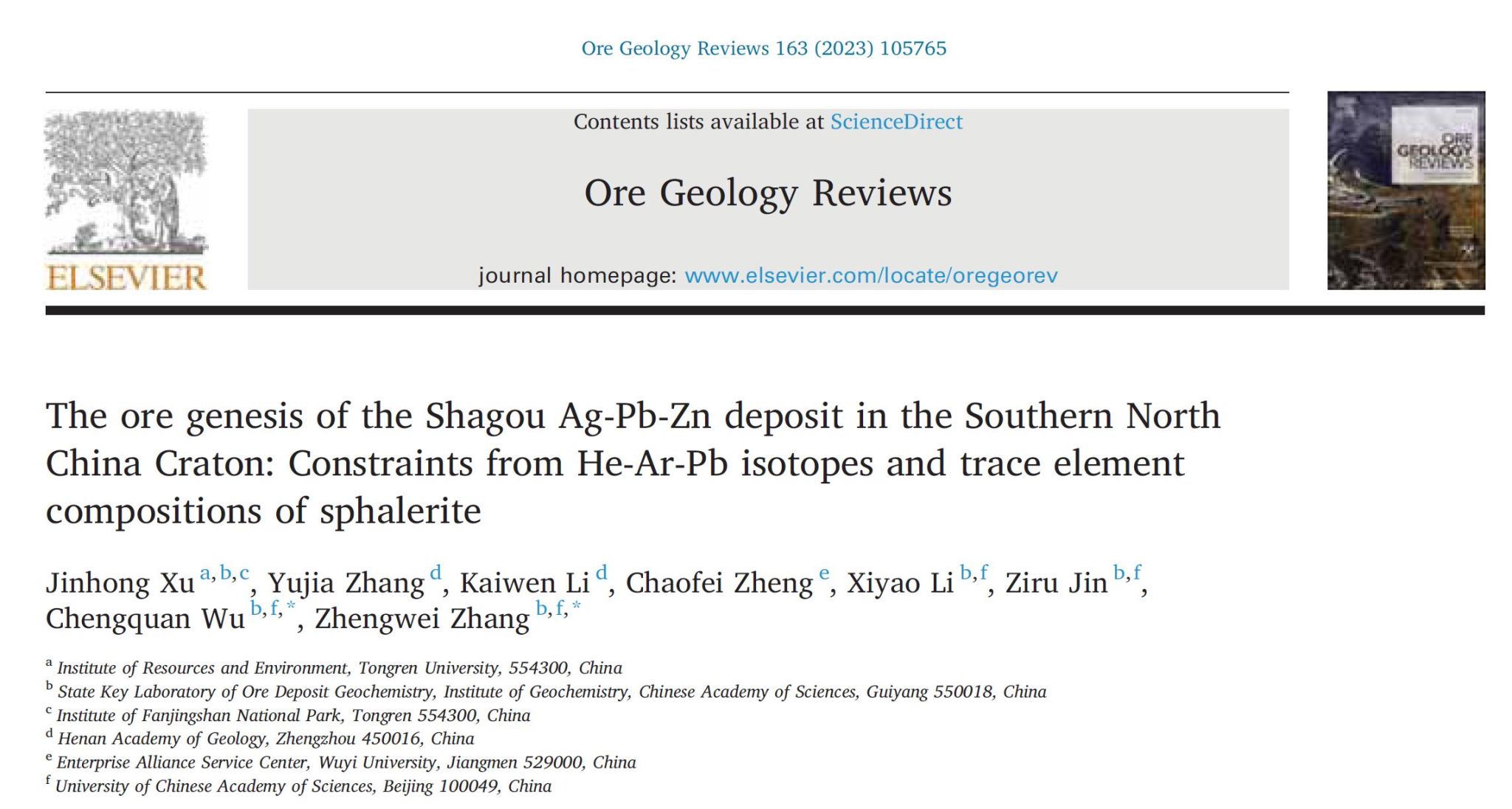 伟德官网经济管理学院、梵净山国家公园研究院徐进鸿博士在其博士阶段工作基础上,与中国科学院地球化学研究所、河南省豫地科技集团有限公司、河南省地质研究院、河南发恩德矿业有限公司等单位合作,以豫西下峪矿田最典型的沙沟和铁炉坪大型矿床为研究对象,通过开展矿物学、同位素地球化学、流体包裹体、原位矿物微量元素等分析,发现银主要以(银)黝铜矿、硫锑铜银矿、辉银矿和自然银等含银矿物产出,少量以次显微包体银为赋存在硫化物中;C-O-S-He-Ar-Pb同位素分析表明成矿物质来源受到岩浆、上元古界官道口群、栾川群和陶湾群碳酸盐岩-页岩-硅质岩建造和围岩太华群共同控制;流体包裹体显微测温和闪锌矿原位微量元素表明成矿流体具有中低温、中低盐度的岩浆热液特征;此外通过区域对比发现这些矿床的深边部具有形成斑岩型Cu-Au-Mo矿床的潜力,为矿山深部矿产资源勘查提供了重要依据。相关成果以徐进鸿博士作为第一作者发表在矿床学权威期刊《Ore Geology Reviews》(SCI二区)和《矿物岩石地球化学通报》(北大核心)上。