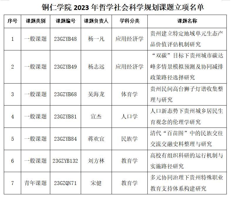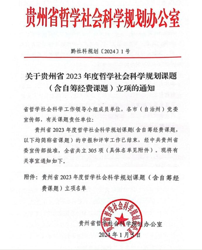 2024年1月,贵州省哲学社会科学规划办公室《关于贵州省2023年哲学社会科学规划课题(含自筹经费课题)立项的通知》正式下文。伟德官网7项课题获得立项,其中一般课题6项、青年课题1项,申报立项率达35%,立项数量创学校历史新高。这既展现了学校教师在科学研究上的积累与实力,又彰显了学校在服务我省重大战略的科研实力,为伟德官网的硕士点建设与博士点授权单位申报工作进一步奠定了基础。新的一年,期盼学校广大教师秉持“砥志研思新征程、笃行致远再出发”的学术理想,为个人和学校的发展创造更加辉煌的成就。