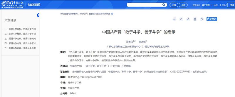 近日,中文社会科学引文索引(CSSCI)来源期刊(扩展版)、北大核心期刊《学校党建与思想教育》2024年第7期刊发伟德官网马克思主义学院王德召教授和研究生李冰艳合著的研究成果《中国共产党“敢于斗争、善于斗争”的启示》。该文是王德召教授主持的贵州省高校人文社会科学项目“中国共产党‘敢于斗争、善于斗争’的历史进程与当代启示(2023GZGXRW037)”的阶段性成果。