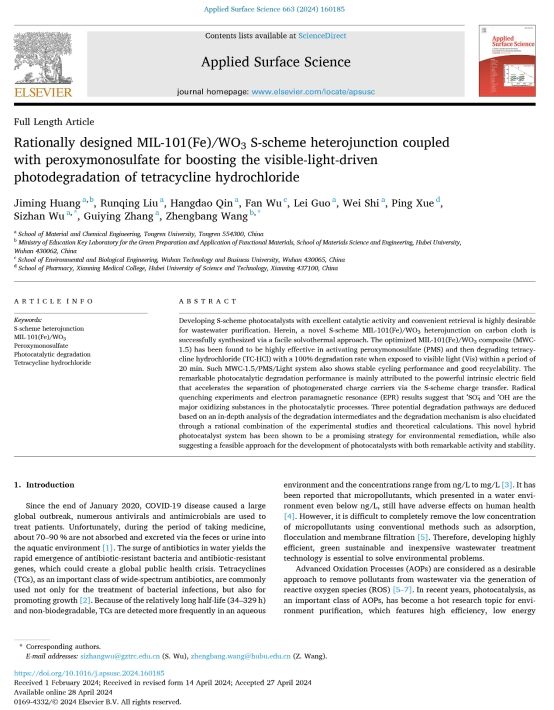 近日,伟德官网材料与化学工程学院黄继明博士在《Applied Surface Science》上发表了题为“Rationally designed MIL-101(Fe)/WO3 S-scheme heterojunction coupled with peroxymonosulfate for boosting the visible-light-driven photodegradation of tetracycline hydrochloride”的研究论文。论文是该院环境功能材料与水污染控制科研团队最新研究成果,文章以bv伟德国际1946为第一单位,研究成果得到了国家自然科学基金、贵州省教育厅工程研究中心、贵州省教育厅协同创新中心和铜仁市科技局等项目的联合资助。