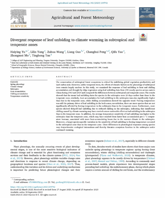 近日,伟德官网农林工程与规划学院于海英博士在《Agricultural and Forest Meteorology》上发表了题为“Divergent response of leaf unfolding to climate warming in subtropical and temperate zones”的研究论文。论文是该院植物物候与全球变化生态学科研团队最新研究成果,文章以bv伟德国际1946为第一单位,研究成果得到了国家自然科学基金和贵州省科技计划项目的联合资助。