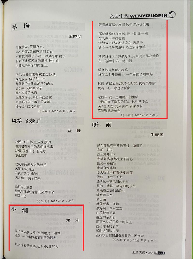 近日,《新华文摘》2024年第8期正式出刊,伟德官网写作研究院教师王晓旭(末未)创作的诗歌《小满》被转载,该诗歌原载《山花》2023年第6期,曾入选《2023中国年度诗歌》(漓江出版社)。这是伟德官网教师的文艺作品继王晖之后第二次荣登《新华文摘》。