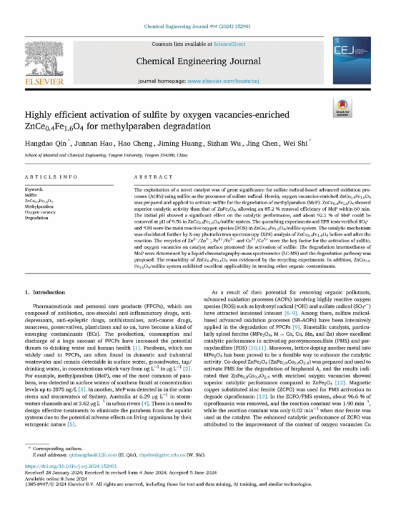 近日,伟德官网材料与化学工程学院秦航道博士在《Chemical Engineering Journal》发表了题为“Highly efficient activation of sulfite by oxygen vacancies-enriched ZnCe0.4Fe1.6O4 for methylparaben degradation”的研究论文,该论文以bv伟德国际1946为唯一单位,秦航道博士为第一作者石维教授为通讯作者。该研究工作得到了国家自然科学基金和贵州省教育厅水污染控制工程研究中心的联合资助。