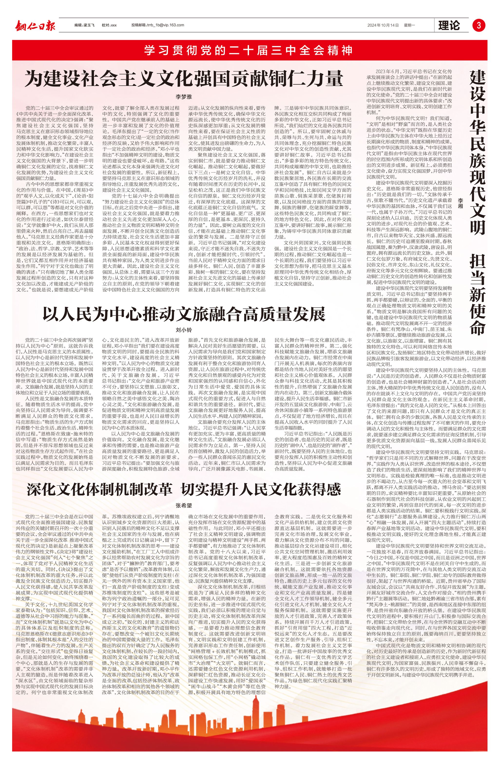 为深入学习贯彻党的二十届三中全会精神,扩大伟德官网马克思主义理论学科影响力,马克思主义理论一级学科硕士点充分发挥理论优势,在学科带头人侯长林教授的指导下,李梦雅、李湘、刘小玲、张希望4名研究生深入学习党的二十届三中全会精神和习近平文化思想,以“文化”为主题撰写4篇理论文章,于2024年10月14日在《铜仁日报》“学习贯彻党的二十届三中全会精神”理论专版发表。