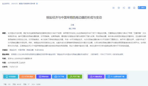 研究认为,在中国古代全时期,铜矿和井盐都是西南地区最具优势的大宗矿产资源,其早期开发实际上也在西南地区形成了若干个铜盐经济圈。巴蜀铜盐经济圈有力推动了早期“巴蜀同囿”文化格局的形成。秦并巴蜀后的西南边疆拓展,汉开西南夷、经营西南夷,蜀地强大的铜盐经济都为其提供了强力支撑。而在西南边疆,其本身也有明显的铜盐经济圈存在,且在圈中的都是西南夷的文明发达之地。汉开西南夷后,有力控制了原有的铜盐经济圈,并进一步开发铜盐经济,为汉代西南边疆的首次大开发提供了重要动力,其开采力量的边界,也基本形成了汉代西南边疆的外部边界。同时,其铜盐经济的深度洗礼之地,也基本成为东晋隋唐间西南地区的华夏文化边疆,从而为新的西南边疆的开发奠定更高更直接的前沿文明平台。空间极限与文化巩固,正是铜盐经济之于中国早期西南边疆形成的前后相继的两层逻辑,而这个逻辑中蕴含的力量,其实也是中华文明与国家起源过程中不可忽视的因素。本文被《新华文摘》“论点摘编”转载,表明其提出的“铜盐经济”概念正式进入主流学术视野。