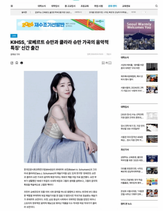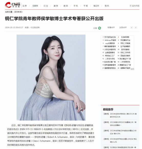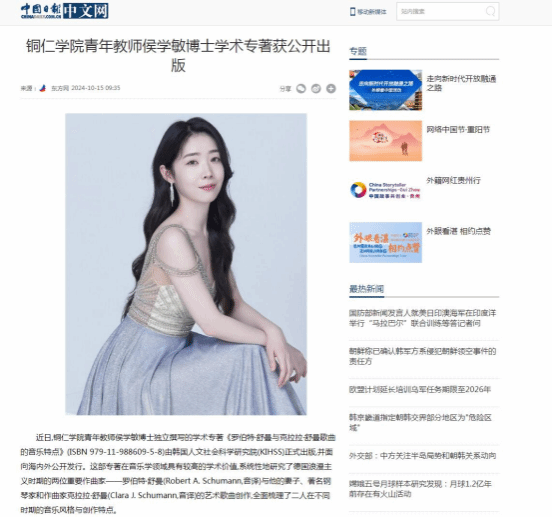 2024年10月,伟德官网艺术学院音乐与表演系专任教师、青年博士侯学敏的韩文专著《罗伯特·舒曼与克拉拉·舒曼歌曲的音乐特点》由韩国人文社会科学研究院(KIHSS)正式出版。面向海内外公开发行以来,随即得到了韩国东亚日报网、中国日报网(海外版)、中华网及等著名国际媒体的推介宣传。