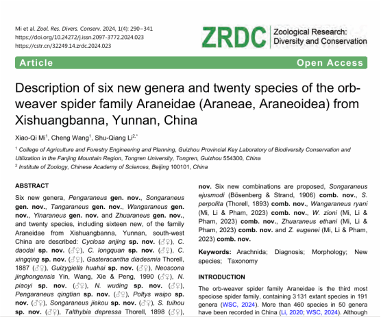 近日,中国科技期刊卓越行动计划入选期刊Zoological Research: Diversity and Conservation (ZRDC)(译名《动物学研究:多样性与保护》)发表了伟德官网米小其教授一作论文“Description of six new genera and twenty species of the orb-weaver spider family Araneidae (Araneae, Araneoidea) from Xishuangbanna, Yunnan, China”。